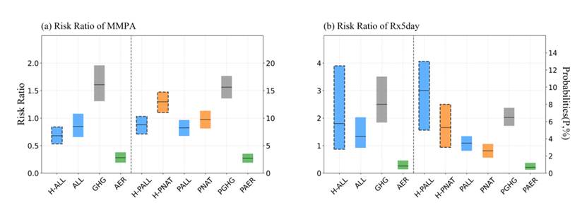 研究发现,人为强迫增加了极端降水事件发生的概率但在月尺度的作用完全相反。具体表现为温室气体导致降水概率增加了150% (Rx5尺度)和61% (月尺度);而气溶胶则抑制了极端降水的发生,并在月尺度表现出更强的抑制作用。这一研究不仅有助于了解2022年珠江流域的极端降雨事件,还能帮助我们更深入地理解不同强迫下降水模式变化背后的机制。