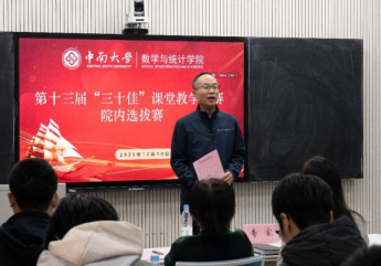 为进一步引导教师潜心育人,提升教师教学水平,2025年12月10日14时30分beat365官方网站第十三届“三十佳”课堂教学竞赛院内选拔赛在数理楼245教室正式拉开帷幕。湖南大学彭豪副教授(第五届全国高校青年教师教学竞赛理科组一等奖)、beat365官方网站刘再明教授、秦毅红教授、王小玲教授、谢斌教授五位校内外专家应邀担任评委,学院党委副书记杨雪宾主持。经报名选拔,共8名青年教师同台竞技。
